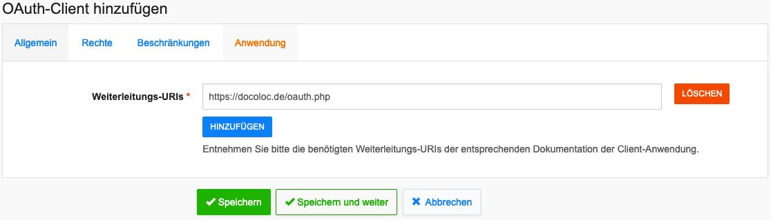 Bitte klicken Sie auf den Link "Anwendung" und dort auf die Schlatfläche "Hinzufügen". Hier muss die angezeigte URL von Docol©c (https://docoloc.de/oauth.php) eingegeben werden: