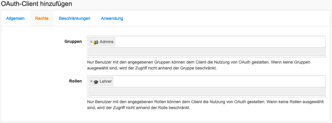 Bitte klicken Sie anschließend oberhalb der Eingabefelder auf den Link "Rechte". Hier können Sie einschränken, welche IServ-Gruppen und -Rollen diese Single-Sign-On Anbindung von Docol©c nutzen dürfen. Sinnvoll ist hier sicherlich eine Einschränkung auf die Gruppe oder die Rolle der Lehrer sowie möglicher Administratoren.