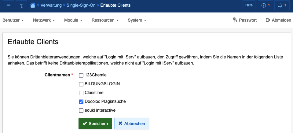 Es erscheint eine Auflistung "Erlaubte Clients" in der Sie durch ein Häkchen vor "Docoloc Plagiatsuche" und einem anschließenden Klick auf den Speichern-Button dieses aktivieren können: