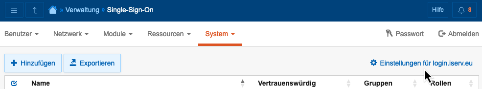 Ist das IServ-Paket "IServ 3: OAuth- und Open-ID-Connect-Server" auf Ihrem IServ installiert, finden Sie im Verwaltungsbereich im Menü "System" den Punkt "Single-Sign-On" über den Sie zur Übersicht der bisher eingerichteten Single-Sign-On Clients gelangen. Klicken Sie auf den Link "Einstellungen für login.iserv.eu" rechts oberhalb dieser Auflistung: